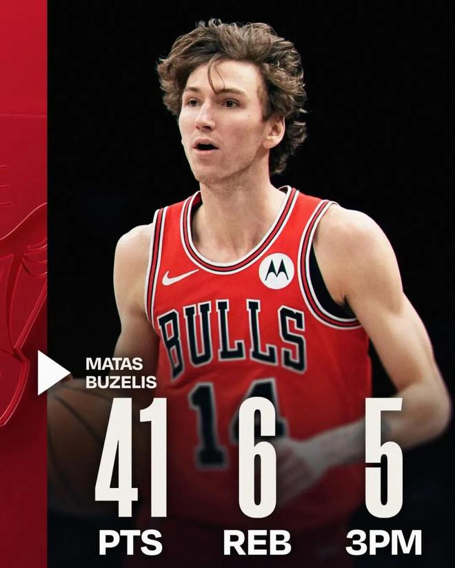 这场比赛,公牛二年级新秀马塔斯布泽利斯打出了生涯至今最好的一场比赛:全场出战45分钟,投篮28中16,三分15中5,罚球5中4,拿下41分6篮板2助攻2抢断2盖帽。