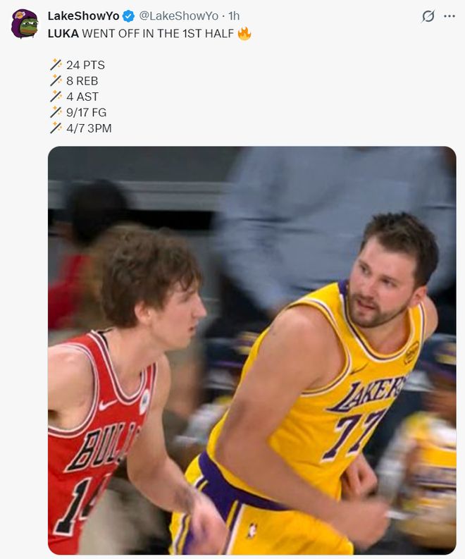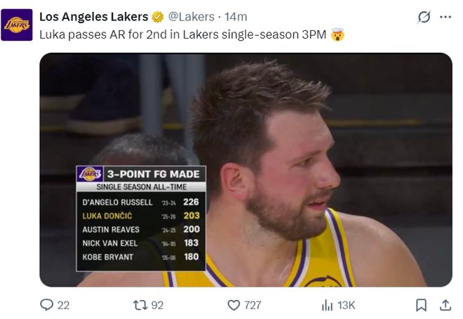 这场比赛东契奇也一战创造多项纪录:1.203+三分已经超越里夫斯成为湖人队史单赛季三分命中第二的球员;