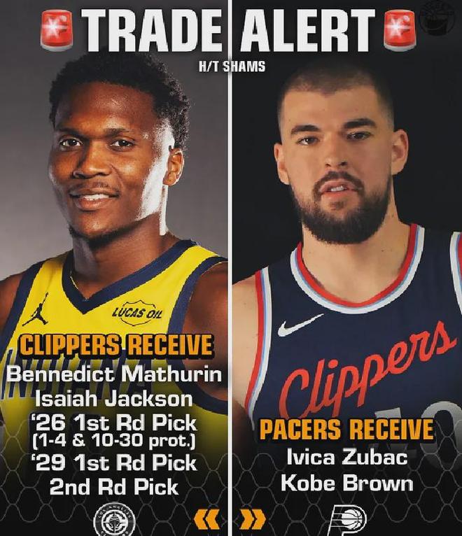 今年交易截止日前,快船将祖巴茨+科比-布朗送至步行者,换回马瑟林+以赛亚-杰克逊+2个首轮签+1个次轮签。