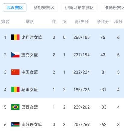 北京时间3月14日晚上,女篮世界杯预选赛小组赛武汉赛区第三轮全部结束,中国女篮86-76击败南苏丹女篮、巴西女篮65-84惨败捷克女篮、比利时女篮81-50狂胜马里女篮。