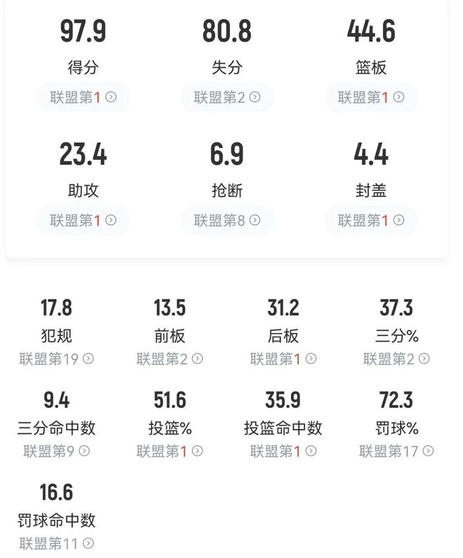 与此同时,百回合得分124.9、百回合失分103.1、百回合净胜分21.8、篮下命中率71.5%和有效命中率48.3%等等,一样全部位列榜首。