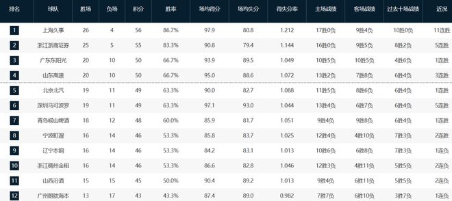本赛季至今,上海队以26胜4负继续高居联盟第一,卫冕冠军广厦队25胜5负紧随其后。