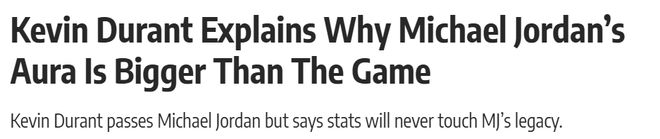 杜兰特的生涯同样足够伟大。他是历史最全能的得分手之一,无死角得分,辗转多支球队、适配多种体系,始终保持巅峰水准。但他也坦然承认,自己与乔丹在文化影响力上,仍有差距。