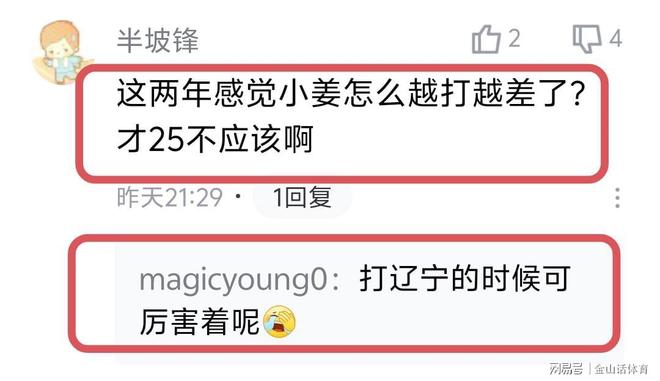 赛后,姜伟泽的低迷表现,也令球迷们非常失望,纷纷吐槽道。“真不行,打不了高端局。”;“这两年感觉小姜怎么越打越差了?才25不应该啊”;“打辽宁的时候可厉害着呢”;“12投3中,当家球星打成这个鬼样子,球队输球就很正常了”……