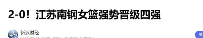 新浪财经:(2-0!江苏南钢女篮强势晋级四强2026.03.30)