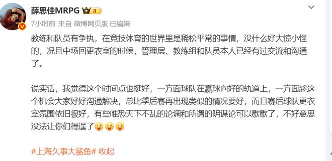 赛后上海队媒体人薛思佳谈到了这次冲突,表示:没什么大惊小怪的,中场回更衣室的时候,管理层、教练组和队员本人已经有过交流和沟通,赛后球队更衣室氛围依旧很好,不用阴谋论。