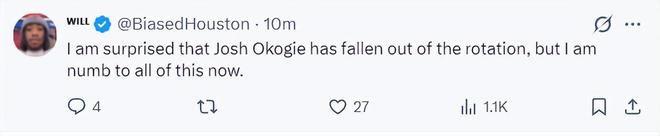 赛后休媒Will依旧不满乌度卡的用人调配,他表示:我很惊讶奥科吉居然被排除在轮换阵容之外,但如今我对这一切已经完全麻木了。