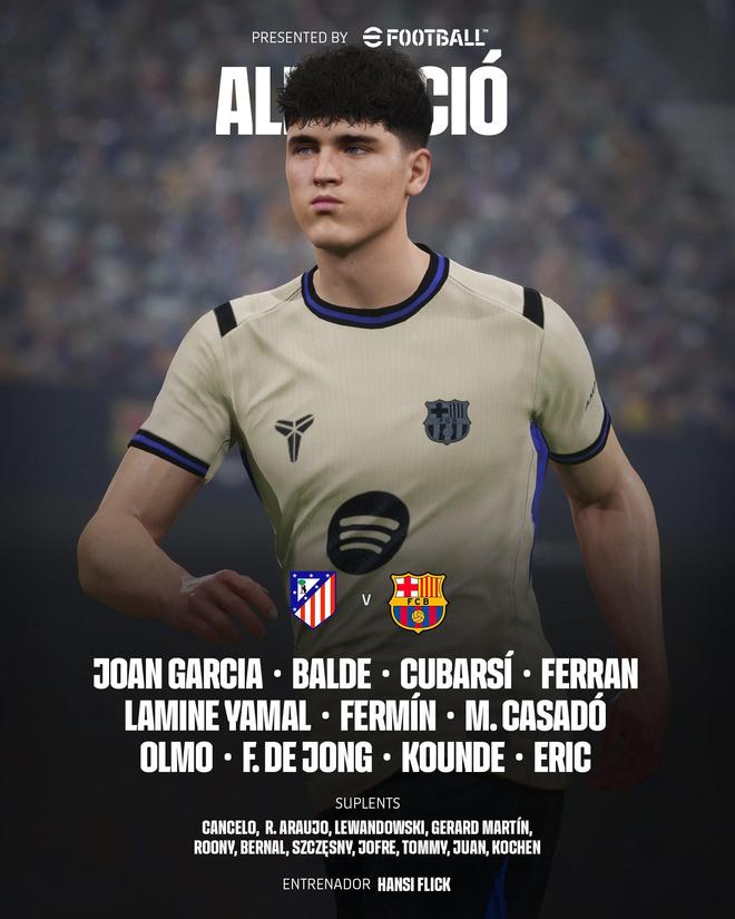 北京时间2月13日04:00,国王杯半决赛首回合的一场较量。马竞坐镇主场,迎战巴萨。赛前,巴萨的阵容公布如下: