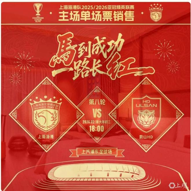 2 月 18 日 18 时,农历马年正月初二,作为中超三冠王的上海海港队将在上汽浦东足球场迎战韩国蔚山 HD 队,这也是球队在亚冠精英联赛小组赛的收官之战。