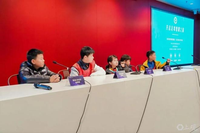 来到新闻发布厅,孩子们系统学习了球场常识、比赛规则、赛场礼仪,以及新闻发布会的完整流程与细节。随后,孩子们化身 “球队发言人”,模拟赛前联席会与新闻发布会环节,勇敢接受 “采访”,大方表达自己对足球的热爱、对球星的崇拜,以及对上海海港队的真诚祝福。