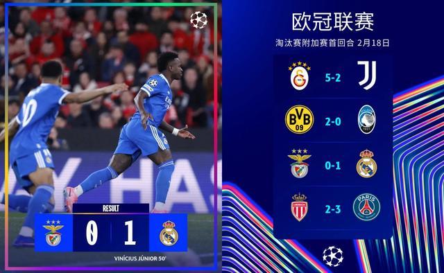 至此,2月18日的4场本赛季欧冠淘汰赛附加赛首回合较量战罢:加拉塔萨雷5-2尤文图斯、多特蒙德2-0亚特兰大、本菲卡0-1皇家马德里、摩纳哥2-3巴黎圣日耳曼。