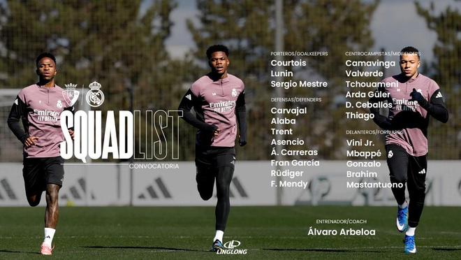 北京时间2月21日,皇家马德里公布了西甲第24轮他们客战奥萨苏纳的大名单,姆巴佩、维尼修斯领衔,罗德里戈、贝林厄姆、米利唐以及赫伊森因伤缺阵。