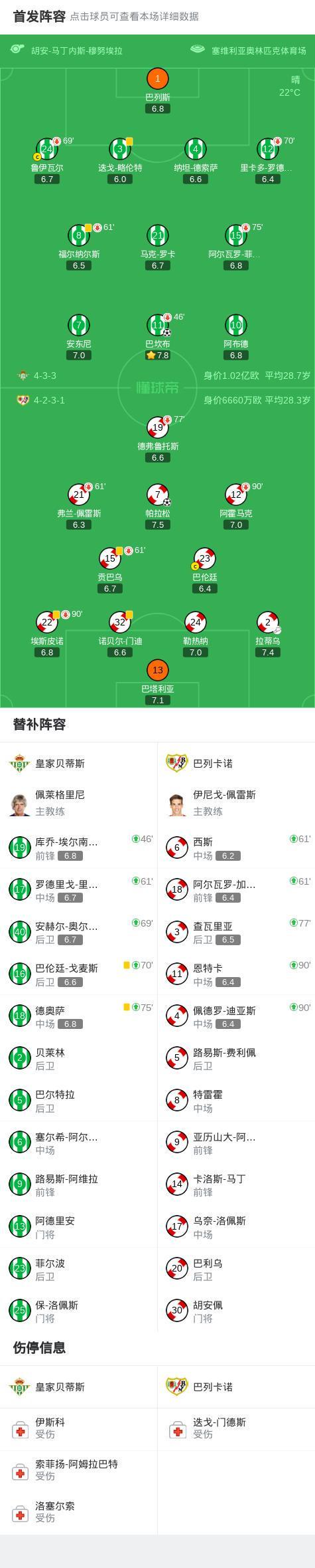 北京时间2月21日西班牙足球甲级联赛第25轮,皇家贝蒂斯主场对阵巴列卡诺。巴坎布率先破门。帕拉松扳平比分。最终比分皇家贝蒂斯1-1巴列卡诺。