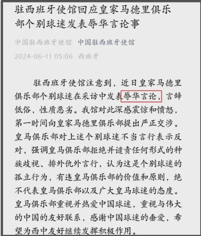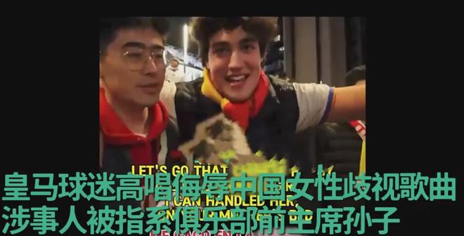 就在2024年,一位体育博主遭到皇马球迷公开歧视,对方引导他演唱侮辱中国女性的歌曲,后续网友还扒出涉嫌歧视的皇马球迷是皇马俱乐部高层的孙子。