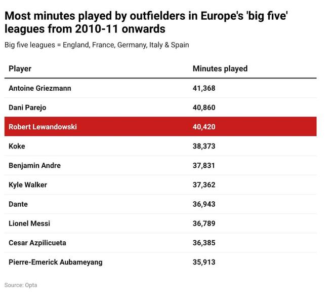 即便如此,在比较他们参加的非本国联赛比赛时,还需要注意一些细节:帕雷霍仅为国家队出场4次,而莱万有139次(并且帕雷霍没有参加过消耗暑期恢复时间的国际大赛);帕雷霍踢了107场欧战俱乐部比赛,而波兰人有150场。格里兹曼代表法国队出场的次数与莱万相仿,但欧战(150对108场)和国内杯赛(62对45场)的出场次数则不及莱万。