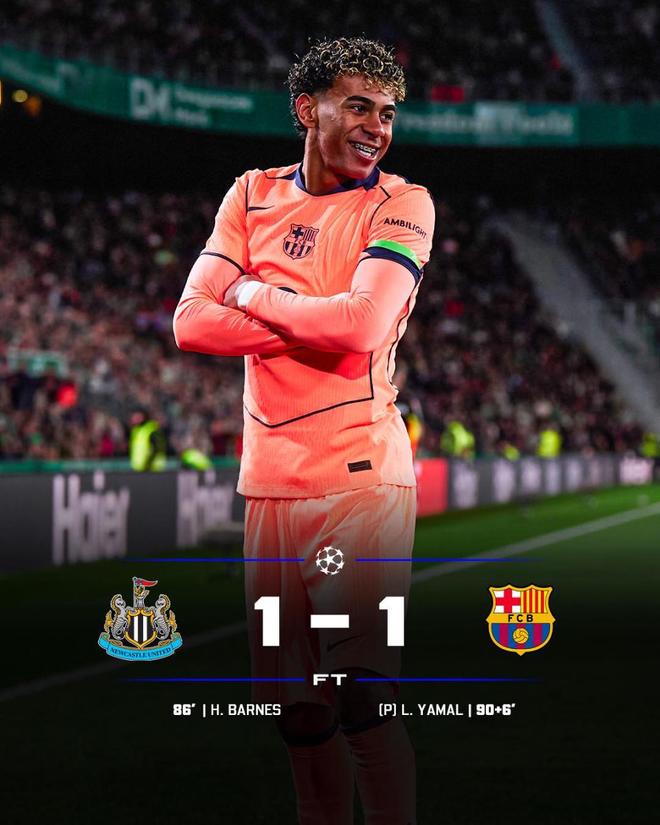 不过在补时阶段,剧情突然反转。奥尔莫在禁区内制造点球,亚马尔顶住压力主罚命中,帮助巴萨在第96分钟绝平比分。