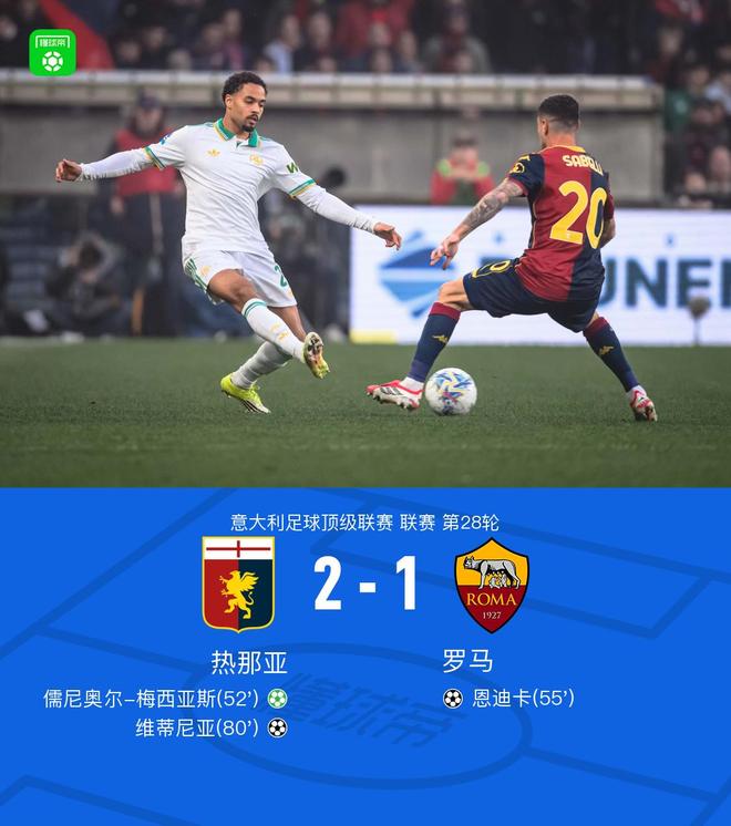 北京时间3月9日意大利足球顶级联赛 联赛 第28轮,热那亚主场对阵罗马。热那亚儒尼奥尔-梅西亚斯破门,维蒂尼亚破门。罗马恩迪卡破门。最终比分热那亚 2-1 罗马。