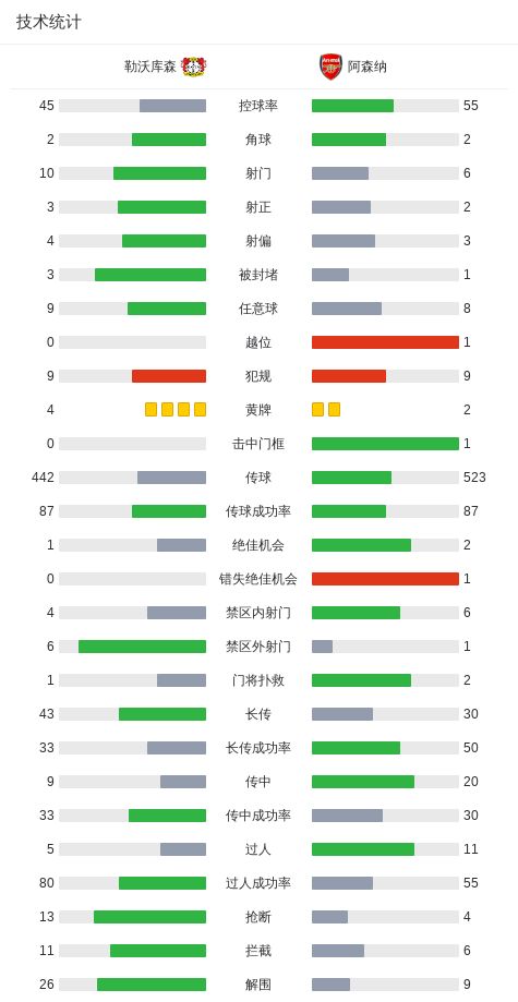 第46分钟,格里马尔多开出角球,安德里希头球破门,勒沃库森1-0阿森纳