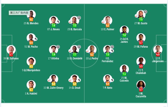 巴黎圣日耳曼首发:39-萨福诺夫、2-阿什拉夫、5-马尔基尼奥斯、25-努诺·门德斯、51-帕乔、17-维蒂尼亚、33-扎伊尔·埃梅里(78’21-卢卡斯·埃尔南德斯)、87-内维斯、10-登贝莱(69’19-李刚仁)、14-杜埃(62’7-克瓦拉茨赫利亚)、29-巴尔科拉(78’24-马尤卢)。