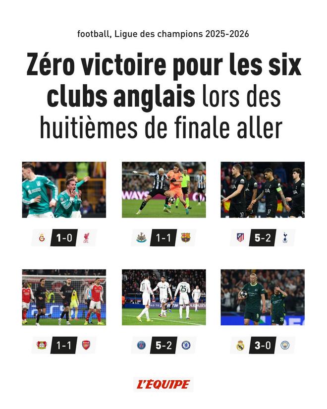 在欧冠八分之一决赛首回合比赛中,英超六支球队均未能取胜,据《队报》统计,这是自2022-2023赛季以来,英超俱乐部在该赛事同一阶段首次出现此类情况。
