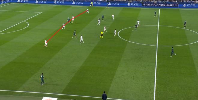第27分钟,皇马从后场左路向前打出反击,尽管途中布拉欣-迪亚斯和维尼修斯未能形成合理传跑,但从弱侧插上的巴尔韦德,还是和再次穿越贝尔纳多-席尔瓦身侧的维尼修斯顺利衔接,从而打出了第二球: