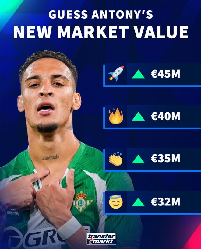 德转即将对西甲球员的身价进行更新。德转预热安东尼身价上涨,最低上涨至3200万欧,最高4500万欧。