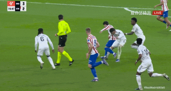 下半场皇马进攻有起色,维尼修斯点射,巴尔韦德抢断后推射得手;替补出场的莫利纳轰入超级世界波扳平;维尼修斯梅开二度再度反超;巴尔韦德染红被罚下;小蜘蛛远射中柱。最终皇马3-2逆转马竞。