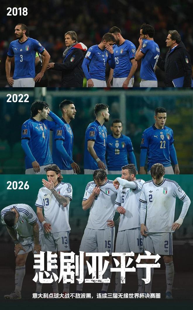 与其说意大利队还是没原谅世界杯,不如说意大利队被别人用自己最擅长的方式给淘汰了。这是命吗?如果是弱队,可以说这就是命了,比如国足在世预赛亚洲区冲击,各种受挫。中国球迷自嘲:“意大利队连续三届缺席世界杯,我们已经连续六次缺席世界杯了!”