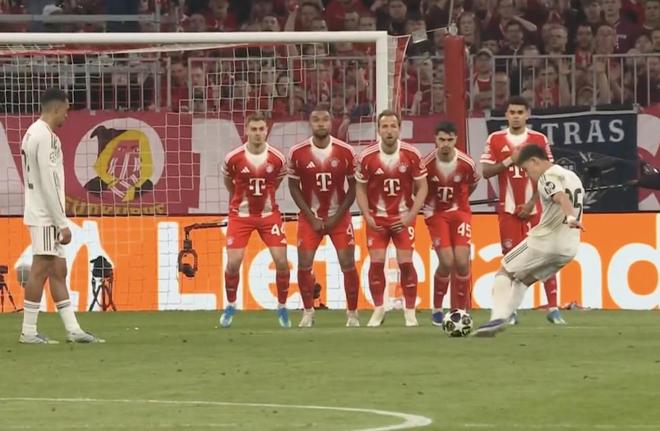欧冠1/4决赛次回合,皇家马德里客场对阵拜仁慕尼黑,上半场居莱尔直接任意球破门,成为自2021年的阿拉巴以来,首位在欧冠任意球破门的皇马球员。