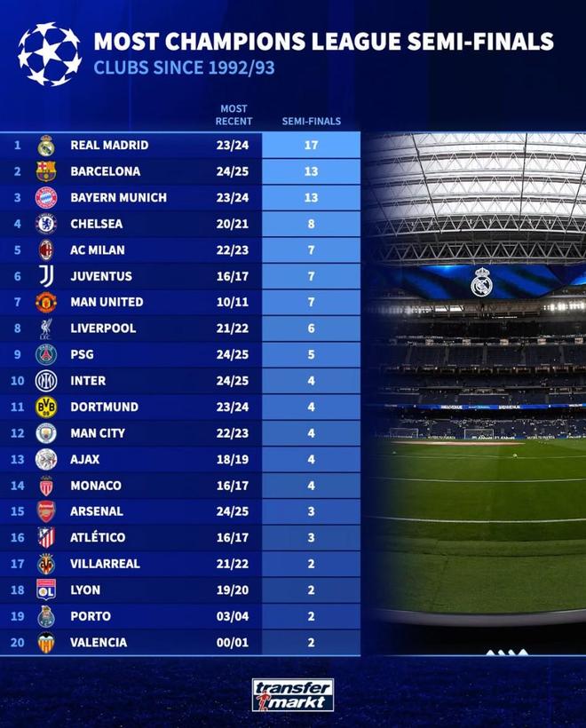 北京时间4月14日,德转列出了自欧冠1992-93赛季改制以来,晋级欧冠半决赛次数最多的20支球队,皇家马德里以17次高居第一,巴塞罗那和拜仁慕尼黑13次并列第二。