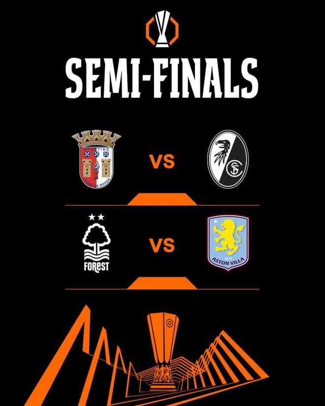 欧联杯半决赛对阵为:弗赖堡vs布拉加;阿斯顿维拉vs诺丁汉森林。